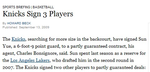 中新網(wǎng)9月14日電 北京時間昨日晚,《紐約時報》曝料稱:孫悅的經(jīng)紀(jì)人查爾斯·包辛諾透露,尼克斯已經(jīng)同中國球員孫悅簽訂了一份部分保障合同,補(bǔ)強(qiáng)球隊后場。