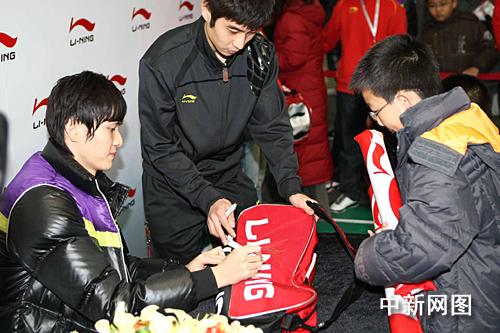 中新網(wǎng)上海十一月二十三日點(diǎn)(宗晨亮)日前,中國(guó)羽毛球名將鮑春來來到“2009李寧・中國(guó)羽毛球公開賽”球迷體驗(yàn)區(qū),和球迷們進(jìn)行了互動(dòng)活動(dòng),還為大家簽名留念。有意思的是,小鮑的球迷多數(shù)都是女性,主持人也拿此事和他開玩笑。