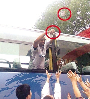 5月23日晚上,湖南湘西某地有關(guān)方面邀請美國體育使者男子明星籃球隊(duì)與立陶宛蘇托瓦職業(yè)男子籃球隊(duì)在該地體育館舉行對抗賽。賽前,兩支球隊(duì)分別到當(dāng)?shù)氐囊恍┲袑W(xué)進(jìn)行訪問,然而,在5月22日美國體育使者男子明星籃球隊(duì)到市第一中學(xué)訪問時(shí)出現(xiàn)讓人憤怒的一幕,一美國球員在車輛離開校園時(shí)打開窗戶,向圍觀的中學(xué)生撒人民幣,造成現(xiàn)場一度失控。