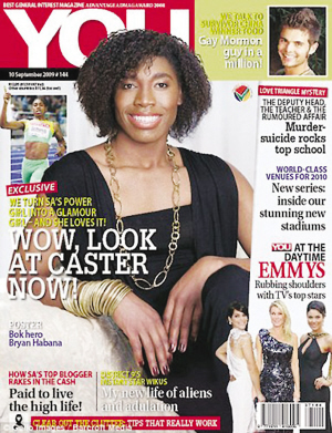 柏林田徑世錦賽上那個(gè)在跑道上讓猛男都自愧不如的800米女子世界冠軍塞蒙婭,已經(jīng)成了南非的民族英雄。盡管有報(bào)道稱她的睪丸激素含量是正常女性的三倍,國(guó)際田聯(lián)對(duì)她的性別檢測(cè)至今仍無(wú)定論,但塞蒙婭如今已搖身一變成了南非時(shí)尚雜志《YOU》的封面女郎。