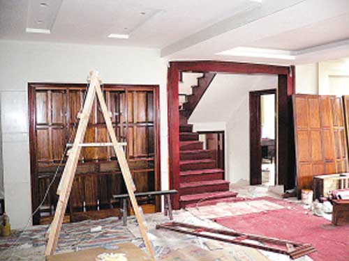 在丁俊暉的伯父丁龍君的帶領(lǐng)下,記者參觀了“江南春天”的內(nèi)部裝修。盡管屋子里仍堆放著一些尚未完成的家具,但整體裝修已經(jīng)初步完成。走進(jìn)客廳,一張紅木的大圓桌映入眼簾!斑@桌子全紅木的,光雕工就要3千多塊,”丁龍君一邊說一邊指著放在邊上尚未拼裝起來的三個大床,“這幾張床也是紅木的,我們請的宜興的師傅,雕工相當(dāng)棒的,這件房子里,只要是木頭就都是紅木的,除了桌子椅子、床和衣櫥,二樓和三樓的博古架,我們連廚房的櫥柜也都用的紅木,包括家里的樓梯、房門和門套。”丁龍君告訴記者,丁俊暉的父親很喜歡紅木的家具,所以在裝修之前花了40多萬買了紅木的木料,家里的家居都是專門請師傅根據(jù)丁俊暉爸爸的要求打的,連工錢一起花了將近60萬。