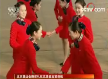 另?yè)?jù)中央電視臺(tái)報(bào)道,練站姿,包括要穿五厘米的高跟鞋,頭上頂課本、膝蓋中間夾白紙,站上一個(gè)小時(shí)要求書(shū)和白紙都不能掉下來(lái)。她們美麗溫柔的笑容,也都是經(jīng)過(guò)標(biāo)準(zhǔn)化訓(xùn)練的!靶σ读桨祟w牙,一定要是發(fā)自?xún)?nèi)心的微笑,”一位頒獎(jiǎng)禮儀志愿者面對(duì)鏡頭如是說(shuō)。