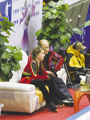 紅黑的緊身衣鑲著亮亮的水鉆,賽場上,小米沙充滿張力的表演酷似“俄羅斯冰上王子”普魯申科!捌蒸斏昕疲克俏业呐枷,不過也是我父母的好朋友。他還親自教我呢!备昝咨车靡獾卣f道。