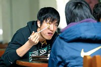 劉翔迅速返回公寓,套上帽衫,陽光很燦爛,劉翔很愜意,他“大搖大擺”、仰著頭,輕哼著流行歌走向食堂!皝砹税!”一走進(jìn)二樓田徑隊(duì)的飯?zhí),立即有廚師倍兒親切地招呼他,劉翔笑著說“餓了”?鐧诮M幾個(gè)人坐到東北角,這是他們的“老地方”。接著劉翔和大伙兒一起排隊(duì),盛上青菜、棒骨、肉末燉粉條、炒雞蛋和白米飯,又拿了個(gè)柚子。