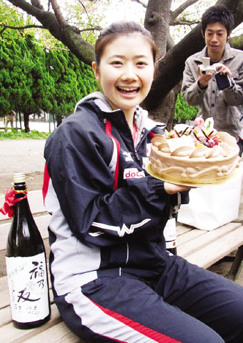 面對(duì)眾人送上的蛋糕,福原愛高興地接受了,但對(duì)來(lái)賓們“整蠱”似地送上的日本清酒,單純可愛的福原愛并不為所動(dòng),“雖然我出生在釀酒世家,但從小就對(duì)含有酒精的清酒味道相當(dāng)?shù)钟|。盡管作為一名成年人可以喝酒了,但我卻依然會(huì)堅(jiān)持滴酒不沾的原則,包括抽煙也一樣,絕對(duì)不會(huì)去碰!备T瓙鄣淖孑叾际轻劸频男屑依锸,據(jù)說(shuō)她的父親福原武彥更是酒量驚人。