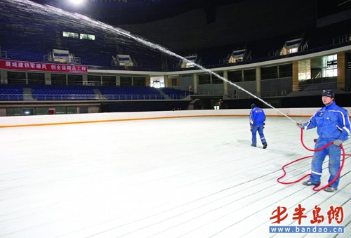 預(yù)計兩天時間,專家就可為1800平方米的賽場鋪上一層大約4厘米厚的冰面,為4月份將要在青島舉行的十一運花樣滑冰和短道速滑的比賽做好準(zhǔn)備。