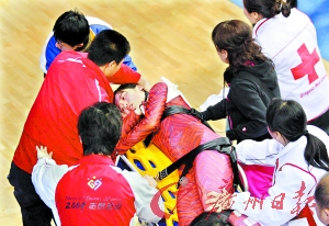 綜合《京華時報》、《今日早報》等報道,4日的全運會短道速滑賽場上出現(xiàn)了驚險一幕;在女子500米預(yù)賽中,新疆小將孔雪的脖子被冰刀劃傷,出現(xiàn)了一道6厘米長的傷口,一時血如泉涌?籽╇S后被送往醫(yī)院縫合了14針。昨日,孔雪帶傷上陣,現(xiàn)場掌聲、加油聲此起彼伏。
