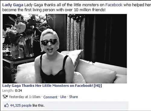 榮登在世人氣女王,她向粉絲發(fā)twit說(shuō):“多謝那么多小魔怪在facebook追隨我。我有1,000萬(wàn)個(gè)互相緊扣的朋友!毙∧Ч謑ittle monsters,正是她給粉絲的昵稱。