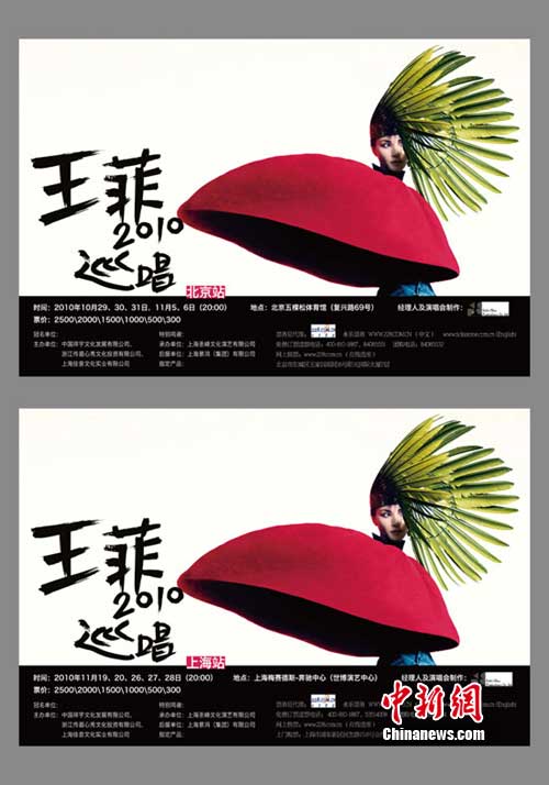 王菲今年10月將復出舞臺,選在國北京的五棵松體育館及上海的世博演藝中心舉行共10場《王菲2010巡唱》。北京站的演唱會日期為10月29至31日、11月5至6日,而上海站則為11月19至20日、26至28日。昨日主辦機構公布演唱會門票售價,最貴為2500元人民幣,最平為300元人民幣,中間并設有500、1000、1500及2000元4種門票,比外界之前預期每張平均過千元的來得“親民”。