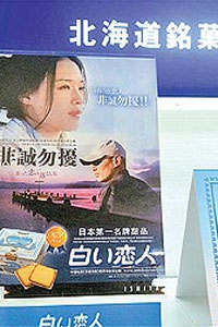舒淇主演的《非誠勿擾》去年在中國創(chuàng)下驚人票房,帶動取景地日本北海道觀光人潮,旅游業(yè)者趁勢推出電影套裝行程,當(dāng)?shù)孛a(chǎn)“白色戀人”餅干更把海報當(dāng)免費宣傳,在當(dāng)?shù)仉S處可見,連名古屋機場也看得到,可說是揚威日本。