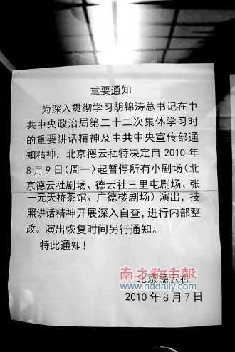 7日凌晨,德云社在其官網(wǎng)德云相聲網(wǎng)上發(fā)表聲明,表示從9日起將停止所有小劇場演出,“北京德云社特決定自2010年8月9日(周一)起暫停所有小劇場的常規(guī)演出,進(jìn)行內(nèi)部整改。具體的演出恢復(fù)時(shí)間,將根據(jù)實(shí)際情況另行通知。特此通告!甭暶鱾鞒觯隙加浾叩谝粫r(shí)間和德云社副總經(jīng)理王海取得了聯(lián)系,電話中,王海拒絕對(duì)此事發(fā)表任何評(píng)論,只是表示“演出近期內(nèi)都不會(huì)恢復(fù)”。