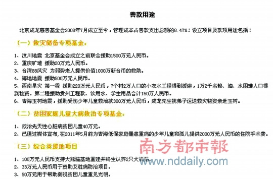 北京成龍慈善基金會成立于四川地震后2008年7月,旨在幫助捐款人成龍及其他所有捐款好友并監(jiān)管各類善款。這次捐款風波的發(fā)生,北京成龍慈善基金會成為關注焦點,善款去向也成為許多人期望了解的內(nèi)容。昨天,該基金會官網(wǎng)上“善款用途”欄目中,一筆歸為救災儲備專項基金的“汶川地震北京基金會成立之前聯(lián)合援助1500萬元人民幣”引起人們關注,有媒體對比先前公開資料,發(fā)現(xiàn)2008年5月13日成龍與楊受成曾以成龍、楊受成基金的名義聯(lián)合捐助了1000萬,而另外的500萬捐助卻無跡可尋,在官網(wǎng)上也并無清晰的說明。因此有關500萬的下落追蹤又引出了新的爭議,對此黨群向南都記者解釋道,這筆500萬元屬于聯(lián)合捐助款項,“這些錢都是在基金會成立之前(捐獻)的,所以沒有走基金會(這邊的程序)。之前媒體報道的是那一大筆錢(指成龍、楊受成聯(lián)合捐助的1000萬),那一小筆(指500萬)沒有報道過,這筆錢采用的方式用途等統(tǒng)統(tǒng)也沒有對外透露,當時是計劃等(項目)全部確實做成了才宣布!