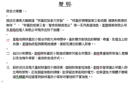就在新聞鬧的沸沸揚(yáng)揚(yáng)的同時(shí),林嘉欣所屬的香港經(jīng)紀(jì)公司星皓昨天發(fā)表聲明,提到“公司和林嘉欣合作9年,堅(jiān)持展現(xiàn)她健康、清新及獨(dú)立的藝人形象。2010年彼此達(dá)成獨(dú)家代理合作關(guān)系。”更強(qiáng)調(diào)“近日出現(xiàn)對(duì)林嘉欣抹黑、詆毀的傷害性消息,正在調(diào)查消息的源頭,并保留法律追究的權(quán)力。”