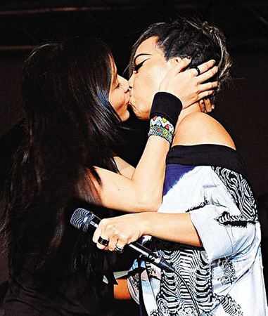 臺(tái)灣天后張惠妹(阿妹)日前于臺(tái)北舉行音樂會(huì),跟千名歌迷作近距離接觸,她笑言:“很久沒有唱過這么近的距離,讓我有點(diǎn)害怕,我連你們的呼吸聲都聽得很清楚!”阿妹還邀請歌手張懸、A-Lin等上臺(tái)合唱,又即興拉蘇打綠主音吳青峰上臺(tái)手拖手合唱。唱到高潮時(shí),張惠妹還與張懸獻(xiàn)上“同性之吻”,惹得歌迷尖叫不停。 (王尚)