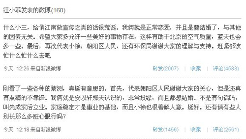 此后汪又再次追發(fā)微博,表示“什么小三,給飯店做宣傳之類的話很荒誕。我倆就是正常戀愛,并且是要結(jié)婚了,與其他的因素?zé)o關(guān)。希望大家多允許一些美好的事物存在,這樣有助于北京的空氣質(zhì)量,藍(lán)天也會(huì)多一些。最后,再次代表小徐,朝陽(yáng)區(qū)人民,還有環(huán)保局謝謝大家的理解與支持。趕緊都該忙什么忙什么去吧!
