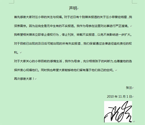 中新網(wǎng)11月2日電 近日,有消息稱大S未婚夫汪小菲曾離婚,并有一女,對此,汪小菲母親、俏江南董事長張?zhí)m女士對其子汪小菲已婚離異的不實(shí)報(bào)道發(fā)出聲明。內(nèi)容如下: