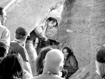 昨日(18日)拍攝的這場戲講的是布蘭登·弗雷澤與瑪麗亞·貝羅遭到敵人的追殺,二人在沙漠中一邊躲避弓箭的襲擊,一邊還擊,雕翎箭與短槍的交火頗有些“關(guān)公戰(zhàn)秦瓊”的味道。布蘭登扮演的里克一身牛仔裝扮,手拿一把短槍,依舊延續(xù)了前兩集中的扮相,而瑪麗亞扮演的艾芙琳則穿著深棕色短款夾克,足蹬馬靴,手持一把手槍。導(dǎo)演羅伯·科恩一聲“開始”后,他們在巖石后緊張地躲避著敵人的追趕,此時,一支雕翎箭射來,擦著布蘭登的右臂射進(jìn)土墻,布蘭登立即伏地掩護瑪麗亞,并迅速用槍還擊,而瑪麗亞也起身與他并肩作戰(zhàn)。盡管這個鏡頭在片中只出現(xiàn)短短的10秒鐘,但科恩導(dǎo)演還是讓兩位主演拍了3遍。