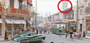 幕后:為了完整重現(xiàn)《色,戒》中30年代場(chǎng)景,李安不惜花了3000萬人民幣在上海搭建了一條完整的“南京西路”,道路兩旁盡是2、3層樓的建筑,共蓋了大小180家商店。據(jù)悉,原著小說中,曾出現(xiàn)店家的陳年照片,李安就根據(jù)這些,再對(duì)照真實(shí)史料,仔細(xì)考究搭建,就連櫥窗內(nèi)的商品也以真品放置。李安對(duì)美工的要求幾乎到了苛刻的地步,連一只杯子都要和當(dāng)年一模一樣。但百密一疏,背景中的高樓影子,本應(yīng)該在后期制作中用電腦刪去,卻疏忽了。