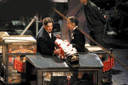 《木乃伊3》的故事來到戰(zhàn)亂的上海灘,秦朝的木乃伊將要復(fù)活,探險家和軍閥幾乎同時而至。正在拍攝的有多場飛車戲,男主角布蘭登·弗雷澤也不例外,新科女主角艾佛林開車,他則站在煙花車的車斗里,用“中國火箭”對瘋狂的“兵馬俑”部隊發(fā)動襲擊,整條南京路都彌漫著硝煙味。