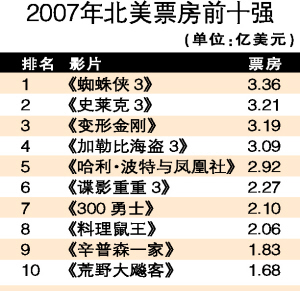 尚有數(shù)天便告別2007年,是時候為好萊塢電影發(fā)一張票房成績表。今年,《蜘蛛俠3》以3.36億美元(約合25億人民幣)成為北美最賣座電影。綜觀今年電影票房,仍然是特技片與動畫片的天下,由香港動畫師許誠毅執(zhí)導《史萊克3》領跑動畫片,以3.21億美元排名第二。