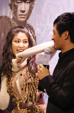 《江山美人》也是三個男人和一個女人的故事,陳慧琳在戲里受到郭曉冬的“陷害”,戲外,陳慧琳為了“報仇”,先發(fā)制人對郭曉冬發(fā)起了“攻擊”,但到最后還是被郭曉冬“欺負(fù)”。
