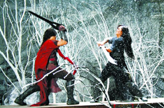 發(fā)布會當天拍攝的是聶風和步驚云的最后一場雪中決斗戲,這也是全片的一場重頭戲。在拍攝時還發(fā)生了一點“意外”,鄭伊健的劍不小心打到了郭富城的頭上,現(xiàn)場工作人員非常緊張,郭富城安慰大家說沒關系,沒流血,結果拍攝結束,郭富城摘掉假發(fā)后才發(fā)現(xiàn),被打到的地方竟然腫得老大,郭富城打趣道:“腫得像乒乓球,就當迎接奧運了!