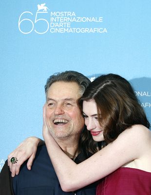 安妮·海瑟薇以一身紅色的抹胸小禮服裙現(xiàn)身,親昵地依偎在導(dǎo)演喬納森·德米身邊。