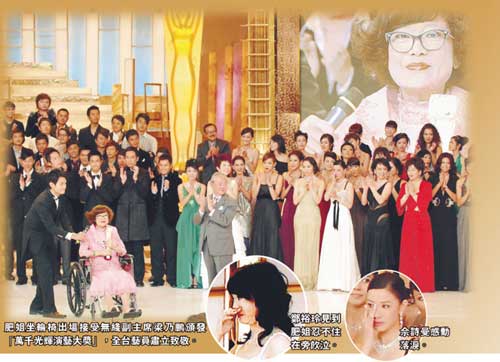 而肥姐沈殿霞自去年9月發(fā)現(xiàn)肝臟有6磅腫瘤后,病情反復(fù),無(wú)奈暫停演藝工作靜心在家休養(yǎng),積極對(duì)抗病魔。從事演藝工作40多年,肥姐貢獻(xiàn)良多,有“開(kāi)心果”之稱。昨晚無(wú)線于《萬(wàn)千星輝頒獎(jiǎng)典禮》特別頒發(fā)“萬(wàn)千光輝演藝大獎(jiǎng)”給肥姐作表?yè)P(yáng),她親自出席領(lǐng)獎(jiǎng),全體臺(tái)前幕后及觀眾站立致敬,掀起整晚高潮。坐在輪椅的肥姐精神不俗,以堅(jiān)定口氣說(shuō):“我不會(huì)輕易放棄我喜歡的電視事業(yè)!辈簧偎噯T看到肥姐都忍不住感觸落淚,在喜悅背后帶點(diǎn)傷感。