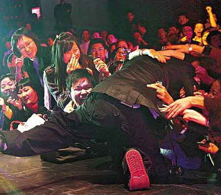 力宏與熱情歌迷握手時,有歌迷緊拉他的手不放,他沒想后果便也以熱情響應,蹲下來與歌迷手牽手地繼續(xù)唱歌,旁邊大班女歌迷見狀也馬上伸出手親近偶像,霎時間群情洶涌,一個又一個女歌迷如狼似虎地抓向力宏,未幾他已被歌迷扯離舞臺,整個人頭向下身體凌空在臺邊,只剩一只腳撐著臺板,該舞臺離地約一米高,眼看力宏快要跌下臺之際,此時才有兩名保安沖上臺及時抱住他的腰,意外才不致發(fā)生。