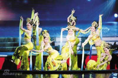 在今年春晚上,舞蹈《飛天》引人關(guān)注:七名仙女打扮的舞蹈演員站在升降舞臺(tái)上,用肢體配合音樂(lè)演繹出敦煌壁畫中的飛天形象,配合著舞臺(tái)上飄落的花瓣和臺(tái)下噴涌而出的水花,一起將觀眾引入“仙境”。