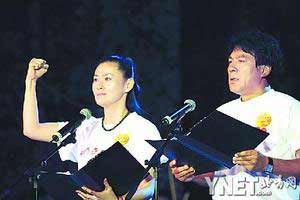 昨晚的演出中,多個名為“故事講述”的節(jié)目成為主角,它們分別由著名演員或相聲名家演繹。蔣雯麗講述了一個母親為了保護自己三四個月大的孩子,被垮塌的樓房壓死,臨死前還在手機里寫下短信:“孩子,你要活著,你一定要記住,媽媽愛你”;鞏漢林金珠夫婦則抒發(fā)了對祖國的深情:“愛心永駐汶川。五月的中國,你讓世界驚嘆”;朱時茂和王思懿則形成組合,朗誦《流淚后我們選擇堅強》。此外,相聲名家姜昆則以《我們選擇堅強》為題,高聲說:“中國不哭,我們不哭!站起來,我們?yōu)槟銚纹鹨黄{天。”所有涉及人物的故事全是真人真事,這些故事讓現(xiàn)場的觀眾非常感動。