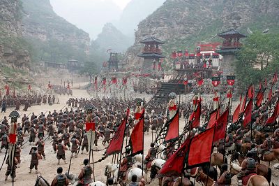 主戰(zhàn)的曹操隨即拉開了《赤壁》(上)中的第一場戰(zhàn)役——新野之戰(zhàn)。當用文字描繪的戰(zhàn)役變成影像,有所改變是自然的。所以,當張飛“當陽橋喝退曹軍”之神奇沒有展現(xiàn),轉(zhuǎn)而是以一個“回光陣”擊退曹軍時,還可以接受。只是感覺,用鏡面反射光線晃眼曹軍的馬匹,使士兵墜馬的鏡頭,吳宇森用得有點多。