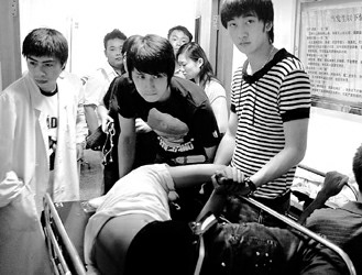 “痛死了!痛死了!”昨天下午,記者在長(zhǎng)征醫(yī)院骨科急診室,見(jiàn)到了在移動(dòng)病床上呻吟的陳澤宇,他側(cè)臥在床上,蜷著身子,嘴唇干裂發(fā)白。病床周圍簇?fù)碇靶值苈?lián)”的毛方圓、巫迪文、鐘凱和他們的經(jīng)紀(jì)人,“好男兒”緊緊抓著陳澤宇的雙手(見(jiàn)圖孫中欽攝),經(jīng)紀(jì)人則買來(lái)礦泉水和吸管,喂他喝水。