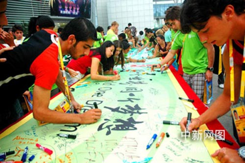 “同一個(gè)世界,同一個(gè)夢(mèng)想”營員們?cè)陂L卷上簽字留念。