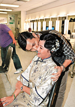 呂良偉在化妝間巧遇舊愛(ài)周海媚,突然親她面頰,周海媚露出尷尬神色。