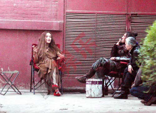 片場休息的Maggie Q煙不離手,貌似瘋子,卻媚態(tài)十足。