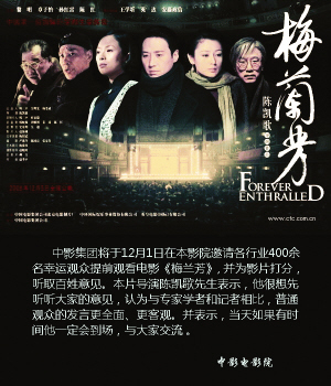 《梅蘭芳》上映首周末就在全國取得了4218萬元的票房。中影集團(tuán)新聞發(fā)言人翁立稱,這是一個讓“各方都滿意”的成績,他透露影片1.2億的票房是發(fā)行方的底線。