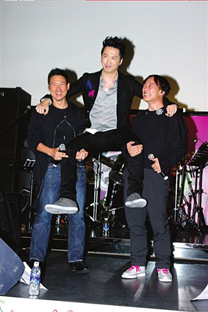 發(fā)布會現(xiàn)場,心情不錯的庾澄慶經(jīng)常大笑得前仰后合,張學(xué)友和陳奕迅更是讓他興奮不已。兩位好哥們兒送上大包的零食,祝福庾澄慶在香港更加“吃得開”。在哥兒仨開唱之前,張學(xué)友特別提醒眾人:“請大家注意歌詞!扁壮螒c哭笑不得地唱起了《愛你的只有一個我》,張學(xué)友和陳奕迅一邊和聲一邊搞笑地伴舞。拍合影的時候,張學(xué)友和陳奕迅合力把站在中間的庾澄慶扛上肩膀,張學(xué)友還不忘問道:“這下心情好很多了吧?”再三被追問如何對待妻子伊能靜的“外遇”,庾澄慶說:“處理完之后會告訴大家的!敝劣谑欠駬(dān)心這個時候推出新碟會被質(zhì)疑借機(jī)炒作,庾澄慶表示:“我不會拿家里的事情做新聞點(diǎn),更何況這件事情很重要。如果我不工作把自己關(guān)在家里,就是很好的解決方式嗎?不是! 記者 朱雅清