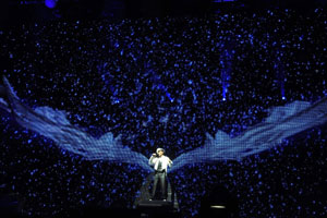 華仔昨晚除了載歌載舞,間中還穿插魔術(shù)秀、音樂劇等,其中音樂劇環(huán)節(jié),他就找來2位辣妹dancers共舞,左擁右抱,又貼身熱舞,又緊緊抱在一起;魔術(shù)秀環(huán)節(jié),還認女助手為“女朋友”,羨煞現(xiàn)場所有女歌迷!