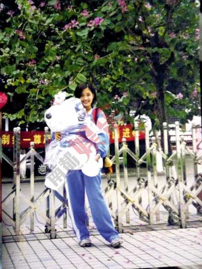 張茆穿著校服抱著公仔。