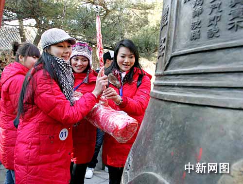 最后,模特與“潭柘寺2008國(guó)際職業(yè)模特大賽中國(guó)總決賽”組委會(huì)人員、門頭溝區(qū)領(lǐng)導(dǎo),在寺內(nèi)撞響古鐘。