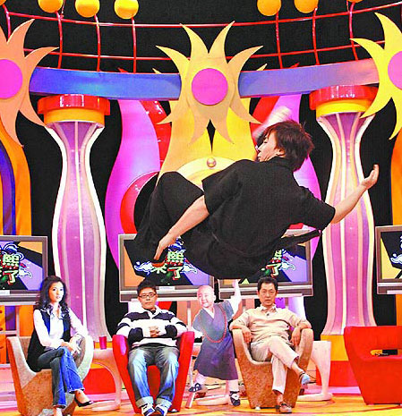釋小龍(前)表演長(zhǎng)拳、凌空騰起,讓朱延平(右起)、郝劭文和葉全真看呆了。