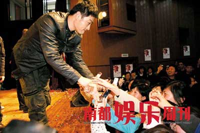 黃維德在舞臺(tái)上盡顯偶像風(fēng)采,中途更深入到群眾中去,和大學(xué)生握手互動(dòng),做男人難,做“小三男”其實(shí)不難。