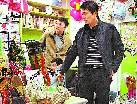陳威陶(右)帶兒子(中)逛禮品店買玩具,小蝦米嚷著要買氣球。