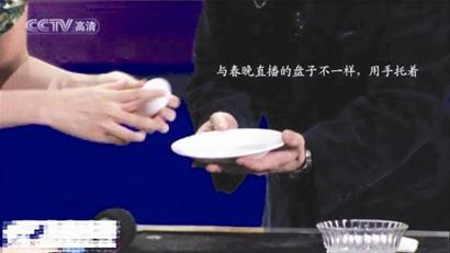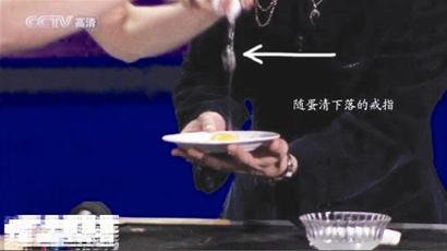 圖七,好了,這一動作做完后,劉謙用左手接過董卿的戒指把玩一番,并問董卿這枚戒指有多貴,這一過程,劉謙很自然地把戒指放到了右手,注意,是塞到了右手的食指和拇指中間,因為右手的食指和拇指中間已經(jīng)捏著個被皮筋拉扯的掛鉤,塞進戒指后他用左手扭動著戒指,好像在做下意識的動作,其實,是把戒指環(huán)掛到那個掛鉤上,這一動作是在右手的食指和拇指“捏合”之中完成的,觀眾是看不到的,由于角度的原因,觀眾也看不到那根細細的皮筋。