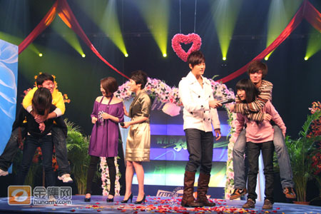 完美的“新娘抱”過后,粉絲的熱情只增無減,演播廳的大屏幕又很是適宜的播放鄭元暢、林依晨主演的偶像劇《我的愛情面包》中,鄭元暢橫抱林依晨參加耐力比拼游戲的片段。主持人張丹丹提議現(xiàn)場派出四名粉絲(兩男、兩女)上臺來玩“耐力大比拼”的游戲。搞怪的鄭元暢更是提議游戲中,由女生背男生進(jìn)行游戲,增加比賽難度。