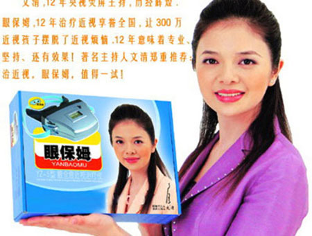 央視主持人文清曾代言治療近視的醫(yī)療器械的“眼保姆”,因廣告“涉嫌欺騙和誤導(dǎo)消費(fèi)者”而被工商局曝光。在廣告中含有大量不科學(xué)的表示功效的斷言和保證,同時(shí)還聲稱“產(chǎn)品銷售現(xiàn)場(chǎng)場(chǎng)面壯觀、多家護(hù)眼中心產(chǎn)品斷貨”等,夸大其辭的廣告語。