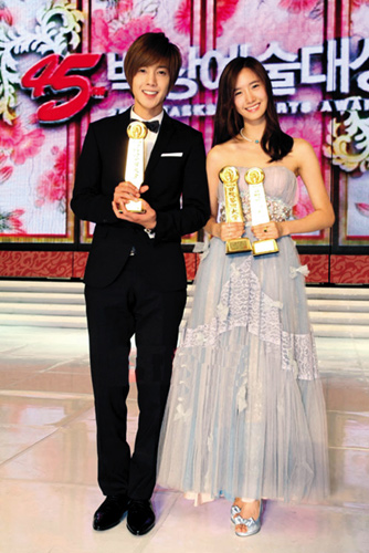 頒獎典禮一開始,李民浩就毫無懸念地獲得電視類男子新人獎,F(xiàn)4的其他三名成員都起身祝賀他。而金賢重所在的組合SS501在頒獎禮上獻唱《花樣男子》主題曲《因為我太傻》以及新專輯主打歌《U R Man》時,現(xiàn)場掀起了高潮。此外,最近憑借新歌《Gee》在歌謠界獲得巨大成功的“少女時代”組合也是當天的人氣王,當成員之一的允兒與金賢重一起獲得電視類人氣獎時,現(xiàn)場粉絲情緒越發(fā)高漲。金賢重領獎時還大吼:“感謝你們!”他表示,從歌手跨界做演員,雖然很累但是遇到了好作品,覺得十分幸運。