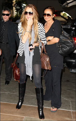 林賽·羅韓脫掉了自己的黑色披風(fēng),機車外套,換上了現(xiàn)在最流行的條紋外套,加上腿上穿的灰色絲襪配黑色高跟靴,時尚性感,當天同行的還有同性女友薩曼莎·羅森,話說薩曼莎·羅森終于脫掉自己那雙粉色底邊的板鞋,換上了這個紅色底邊的板鞋。林賽則一直忙這再打手機。