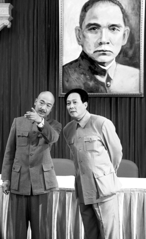 10點(diǎn)30分,正式拍攝開(kāi)始。上午的第一場(chǎng)戲是張國(guó)立扮演的蔣介石和唐國(guó)強(qiáng)扮演的毛澤東,在眾多國(guó)民黨高官的掌聲中步入晚宴現(xiàn)場(chǎng)。兩人站停在長(zhǎng)桌前的時(shí)候,眾人舉杯。一位演員叫道:“蔣委員長(zhǎng)說(shuō),讓我們?yōu)榱撕推,干杯!庇谑潜娙嗽谧h論聲中舉起手中的紅酒。張國(guó)立對(duì)導(dǎo)演的要求言聽(tīng)計(jì)從,完全沒(méi)有之前所傳的“戲霸”模樣。拍攝間隙回到休息室里,張國(guó)立放松了很多,也不介意記者的鏡頭和頻頻亮起的閃光燈。他談到自己在前幾天的拍攝中發(fā)了幾天高燒,足足燒到了39℃,把眼睛也給燒壞了!爱(dāng)時(shí)我媳婦兒來(lái)看我,我迷迷糊糊一睜眼,嚇了一跳,喲,我怎么有倆媳婦兒!”原來(lái)張國(guó)立的右眼在高燒時(shí)不能轉(zhuǎn)動(dòng),導(dǎo)致看東西有重影。直到醫(yī)生給他打了很多激素,癥狀才逐漸減輕。張國(guó)立苦笑著回憶說(shuō):“當(dāng)時(shí)馮小剛還和我開(kāi)玩笑。他說(shuō),導(dǎo)演應(yīng)該在那個(gè)時(shí)候找我談片酬哇,看什么都是雙份兒的!